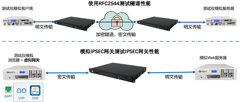 - 使用网测仪表RFC2544套件,测试两台网关之间IPsec隧道的性能,比如吞吐、时延、抖动